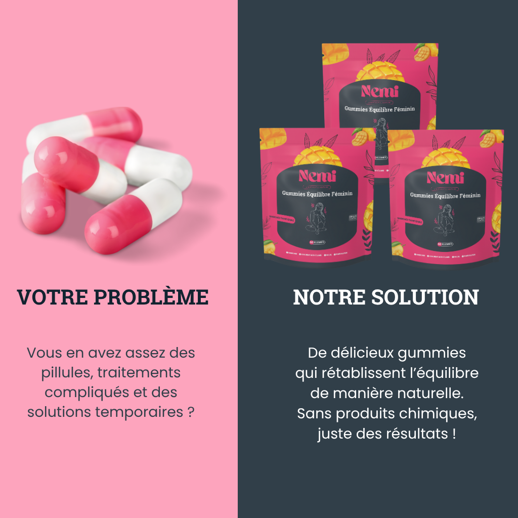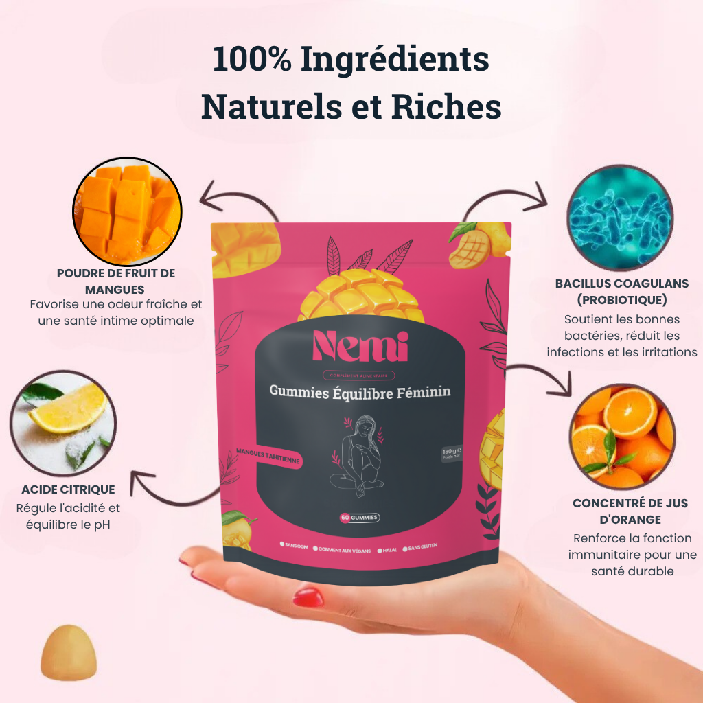 Les gummies équilibre féminin de Nemi sont tout ce que j'espérais et plus encore. Le goût est incroyable, ce qui me permet de ne jamais oublier de les prendre. Après seulement quelques jours, je me suis sentie plus équilibrée et confiante. Je les recommande à toutes mes amies !