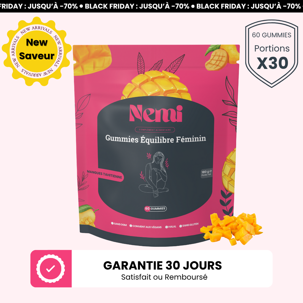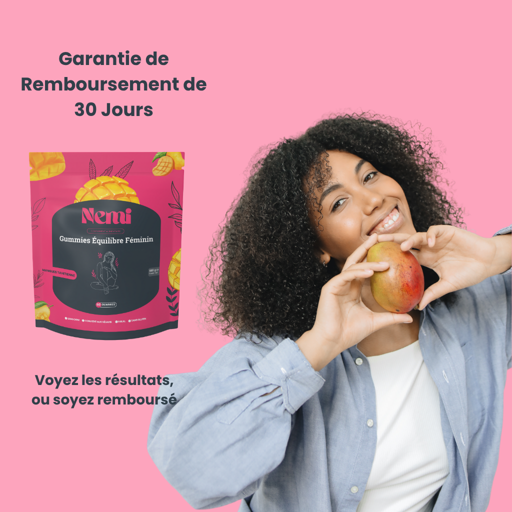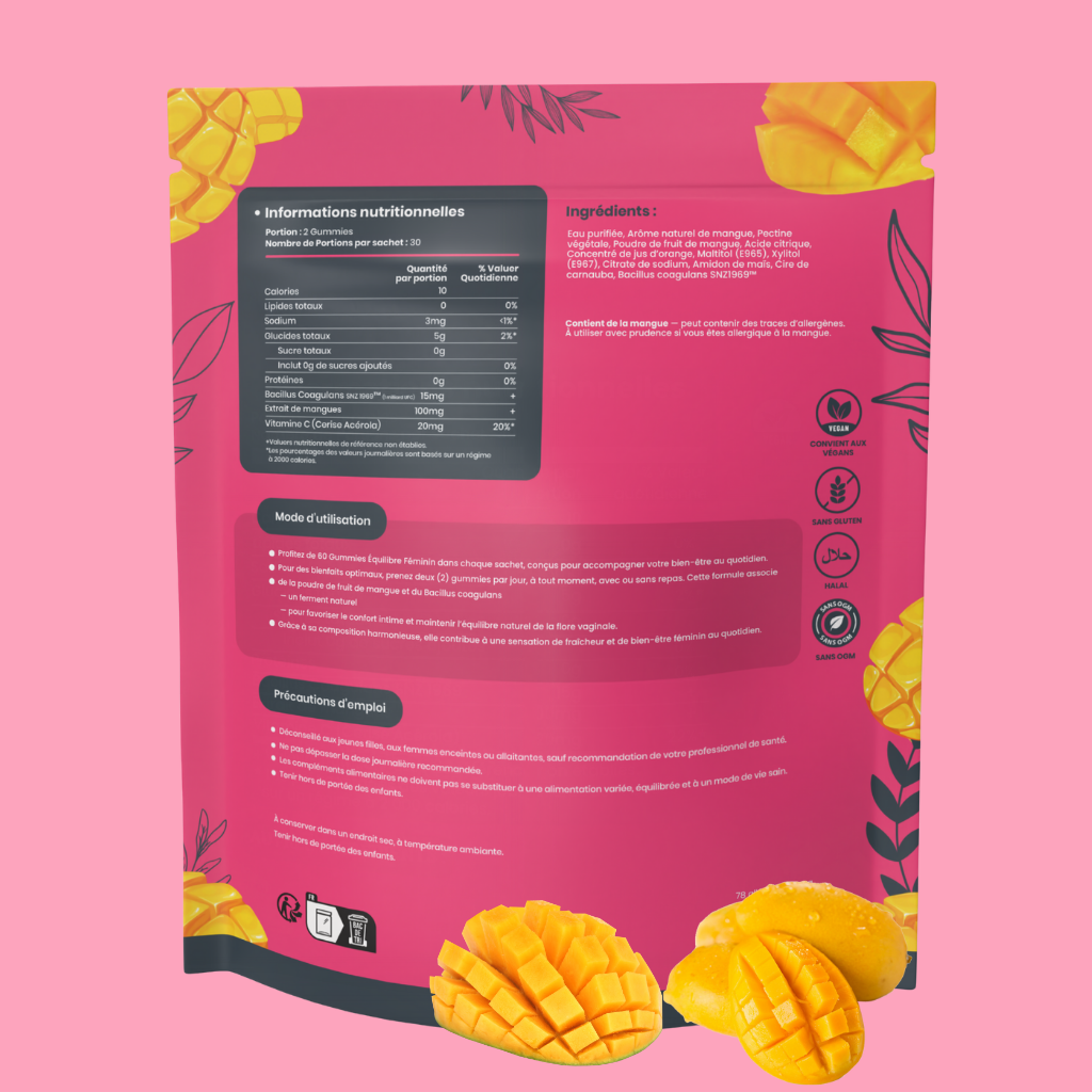 Les Gummies Équilibre Féminin sont enrichies en extrait de mangues et en probiotiques uniques, agissant naturellement pour :