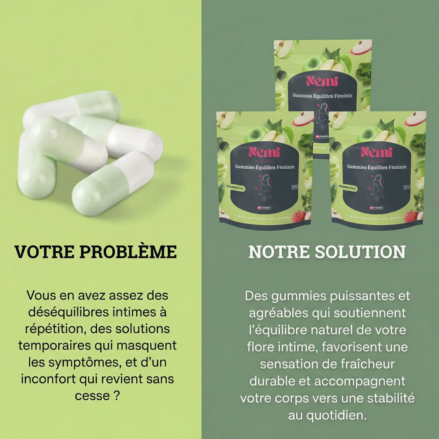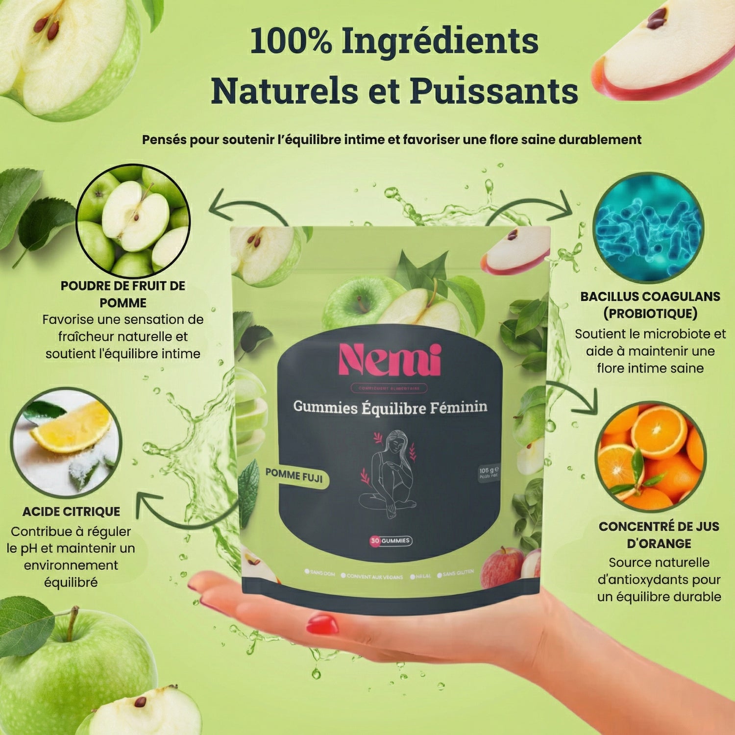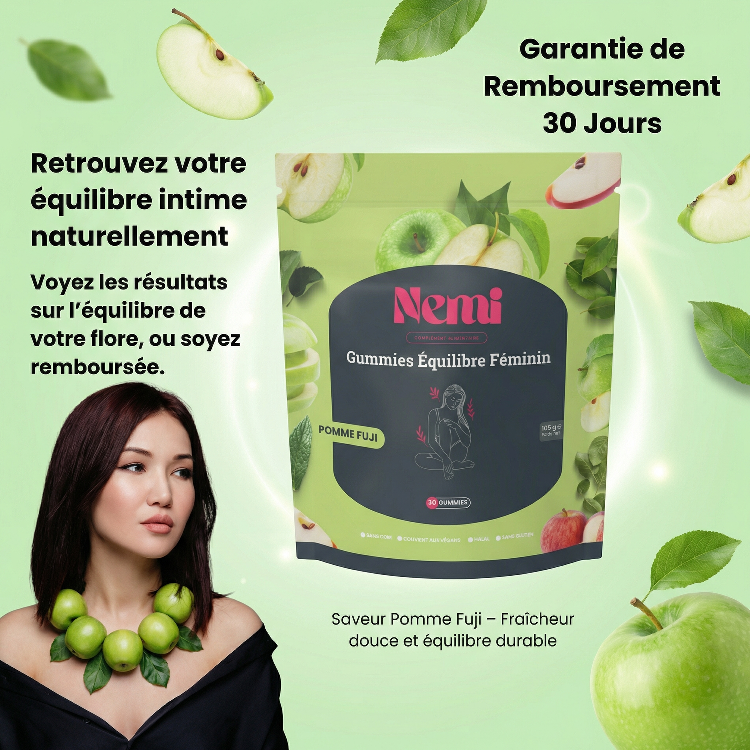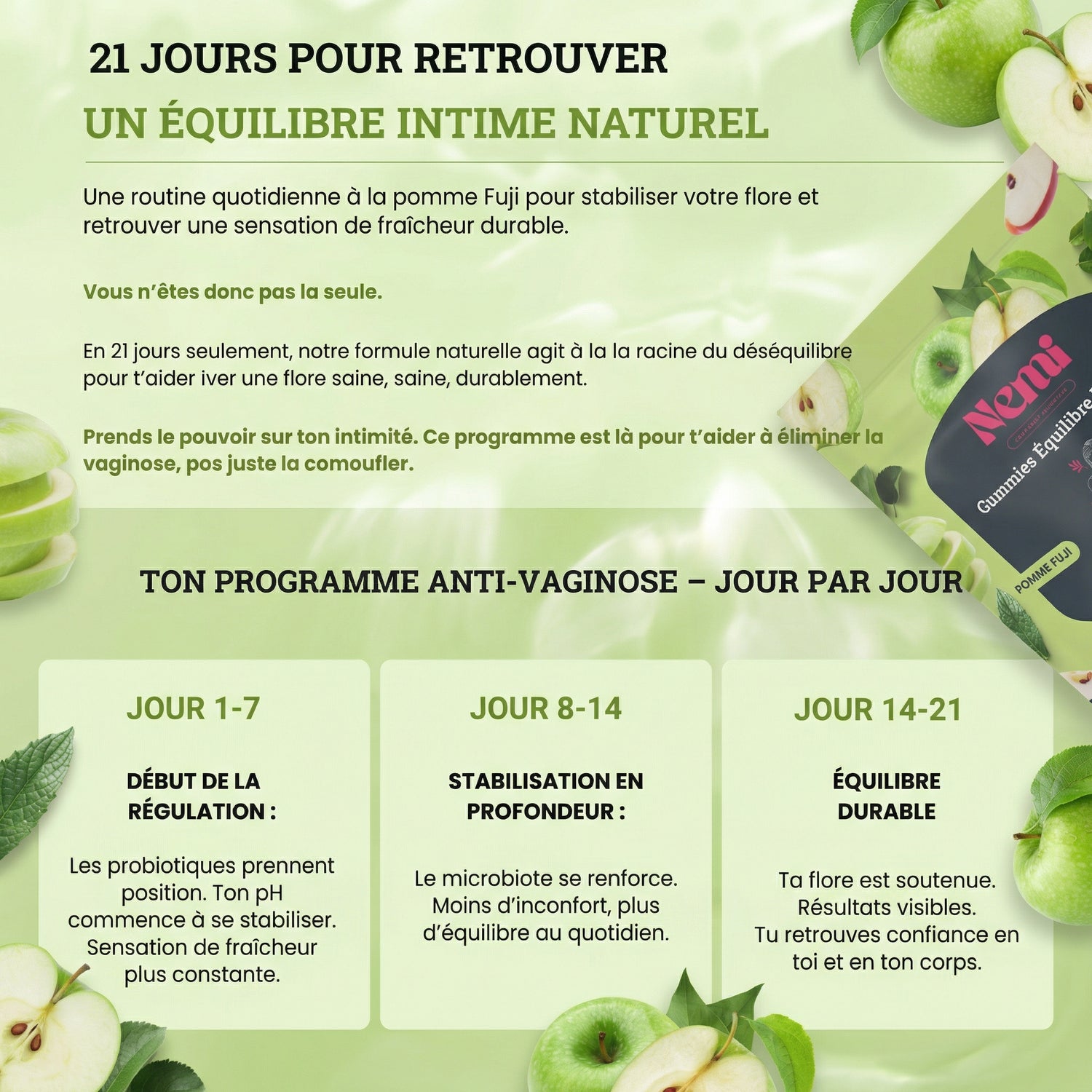 Nos gummies à la douce saveur de pomme Fuji offrent une solution complète pour soutenir votre équilibre intime, renforcer votre confiance et préserver votre fraîcheur au quotidien. Conçues pour accompagner les femmes modernes, elles allient plaisir, naturalité et efficacité.